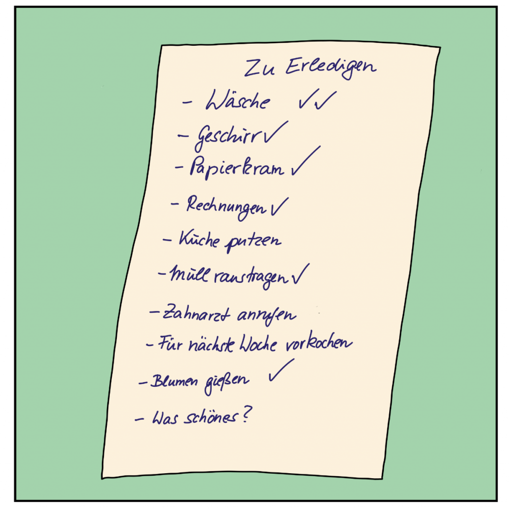 Ich kann mir selbst erst einmal etwas Mitgefühl entgegenbringen und dann nach einer Lösung suchen, wenn eine nötig ist. Das heißt, wenn ich merke, dass ich den Einkaufszettel vergessen habe, kann ich sagen: „Du musst wirklich müde sein, wenn du ihn zu Hause vergessen hast. Danke, dass du trotzdem einkaufen gehst“, und mir dann einen Moment Zeit nehmen, um eine neue Liste zu schreiben.